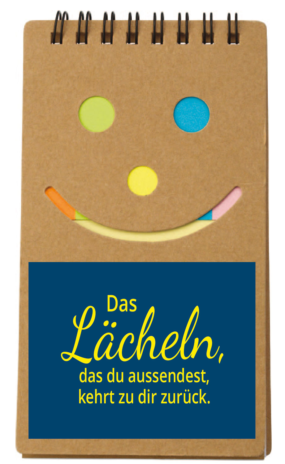 Notizblock aus Karton mit 50 linierten Blättern, Ringbindung, 20 Haftnotizstreifen in 5 Farben und 50 gelbe Haftnotizzettel.